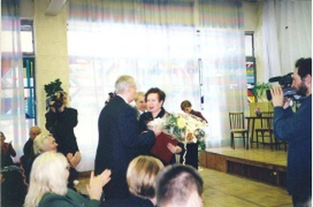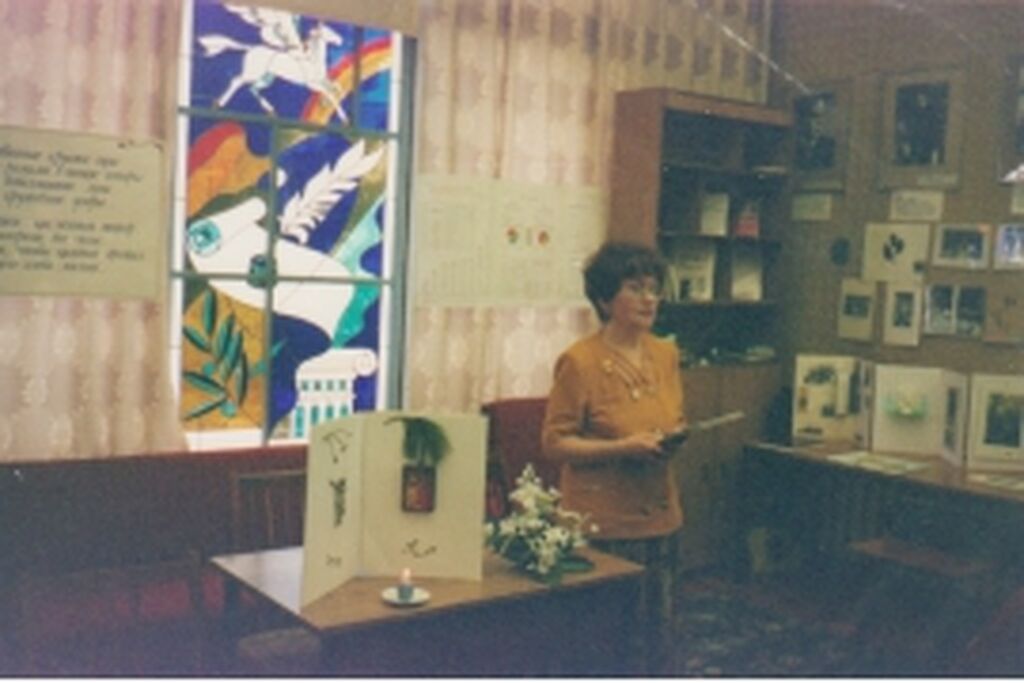 Цветы в честь открытия музея его основателю В. И. Николаеву вручает директор библиотеки В. И. Исаева |
